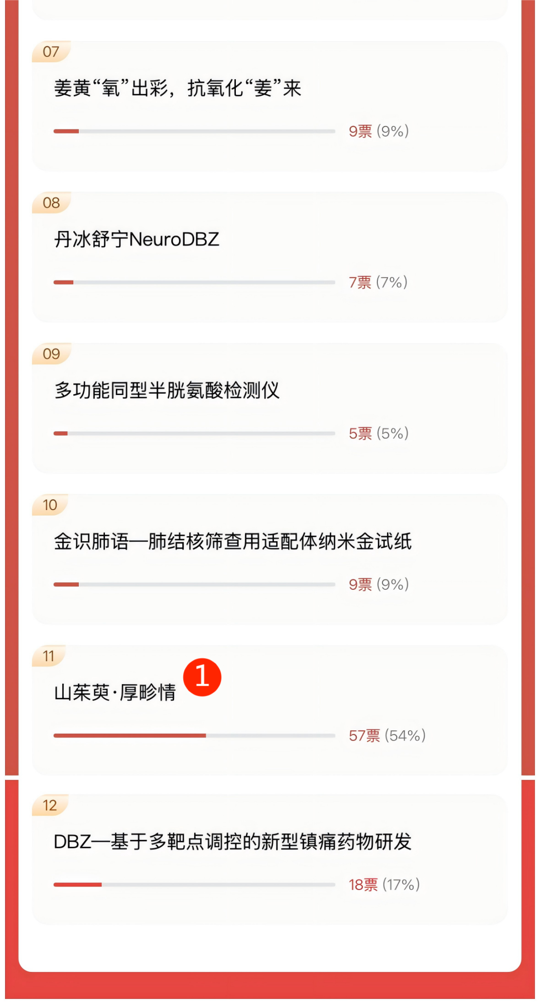 本次成果展共有12个获奖项目制作了展板并参与投票。活动期间,全校师生踊跃投票,最终投选出《山茱萸·厚畛情——深耕秦岭北麓“红果果”,助力乡村致富“金豆豆”》为“我最喜爱的项目”,以下为投票结果。