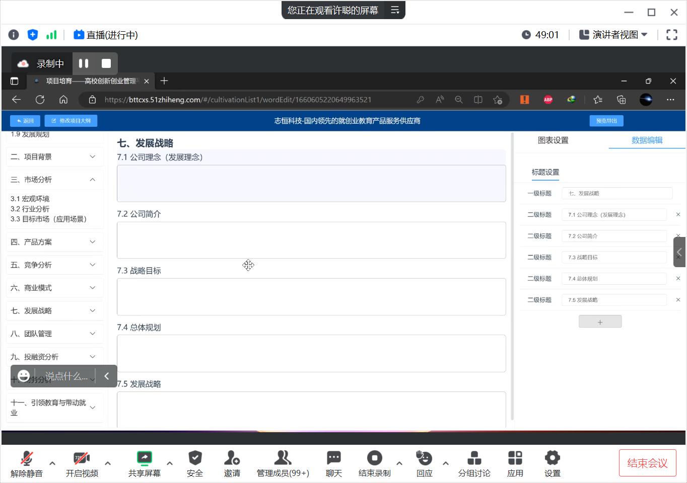 首先,技术负责人介绍了项目培育系统的各项功能,并详细介绍了学生如何围绕项目培育系统撰写一份优秀的商业计划书;其次,技术负责人以部分项目为例,介绍了优秀的商业计划书体例和模板;最后,我校师生与技术负责老师进行了互动交流和答疑。