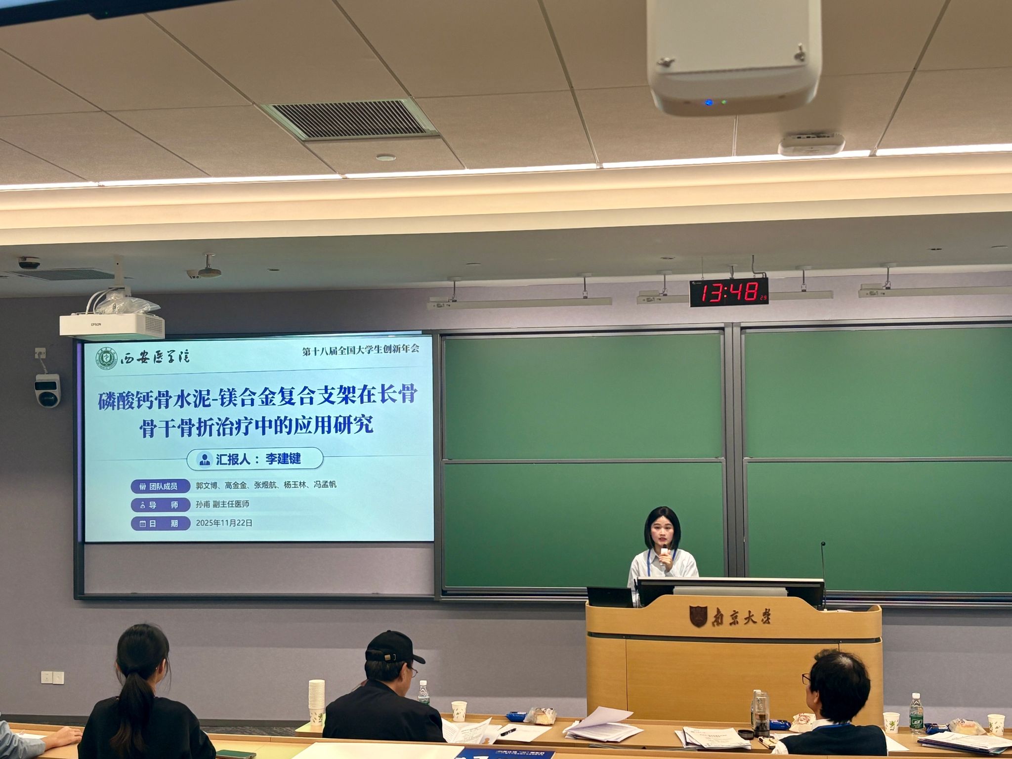 项目成员李建键在现场汇报环节,对国家级项目《骨水泥-镁合金复合支架的设计与研究》的研究背景、技术路线及阶段性成果等概况,结合已发表的相关学术论文进行了详细阐述,并围绕现有研究思路的创新点与可行性、后续研究计划的实施步骤及预期目标等关键问题,与评委展开深入讨论。